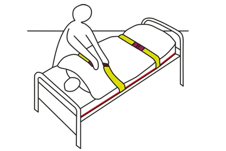Eine Pflegekraft evakuiert immer nur einen Patienten. Das Zimmer betreten und den Patienten kurz informieren (z.B.: Wir haben einen Brandschaden im Haus und ich bringe Sie jetzt in Sicherheit!). Die seitlichen Klettverschlüsse fassen und über der Bettdecke fest miteinander verbinden. Die Arme des Patienten sollen dabei lang ausgestreckt unter der Bettdecke / dem Gurt liegen.