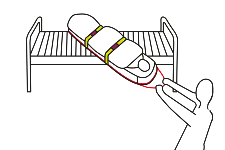 Die Liegefläche auf die niedrigste Höhe bringen. Ist eine Verstellung nicht möglich (Stromausfall oder zu zeitaufwändig) wird dieser Punkt übersprungen. Das Zugband am Kopfende mit beiden Händen fassen und den Patienten mit dem Kopf zuerst seitlich von der Liegefläche ziehen (im Winkel von ca. 75° < 90°). Sobald nur noch der Rumpf auf der Liegefläche liegt, gleitet das Evakuierungstuch ganz leicht auf den Boden. Der Patient ist während der ganzen Zeit durch seine Matratze geschützt.