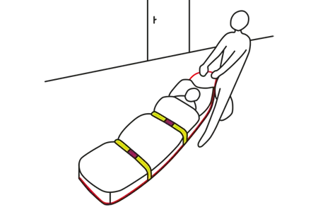 Das Zugband am Kopfende weiter festhalten und mit ausgestreckten Armen den Patienten mit dem Kopf voran über den Boden ziehen. Dabei wird das eigene Körpergewicht als Zugkraft mit genutzt. Der Patient sieht dabei entgegen der Zugrichtung und berührt nur mit dem Unterkörper den Boden. Vor seitlichen Berührungen mit Türkanten, Stühlen, Tischbeinen und Wänden ist der Patient durch die Matratze seitlich bestens geschützt. Auch automatisch schließende Türen können den Patienten nicht berühren.