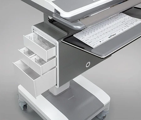 Durch seine flexible Konstruktion kann der Wagen mit einer breiten Palette an Zubehör ausgestattet werden, einschließlich Halterungen für Scanner, Kameras, Desinfektionsmittelspender und vieles mehr. Dies ermöglicht eine individuelle Anpassung an die vielfältigen Anforderungen des medizinischen Alltags. Zudem bietet die Option, ein digitales Medikationssystem zu integrieren, eine innovative Lösung zur sicheren und nachvollziehbaren Gestaltung der Patientenversorgung.