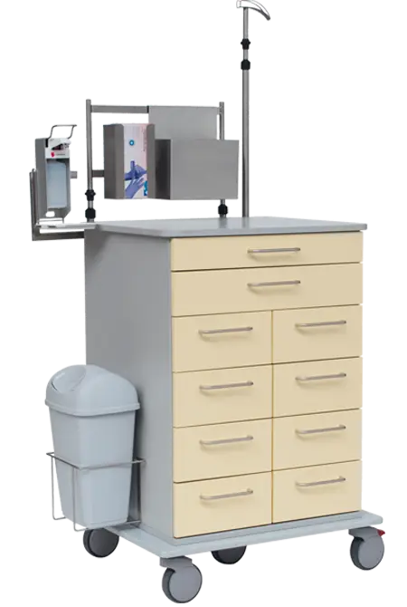 Um Ihnen auch über das Erscheinungsbild hinaus den bestmöglich auf Sie zugeschnittenen Service bieten zu können, steht Ihnen eine große Auswahl an optionalem Zubehör zur Verfügung. Dazu zählen beispielsweise die Edelstahlgalerie, das ABS-Top, abklappbare Schreibplatten, Abfallbehälter, Schubladenteiler, Funktionsschienen, Schüttenhalterungen oder Trägerwände für ISO-Module. Hier können Sie Ihren ganz persönlichen Alltagshelfer konfigurieren. So werden Ihre neuen Pflege- und Arbeitswagen zweifelsfrei auch den höchsten Ansprüchen gerecht!