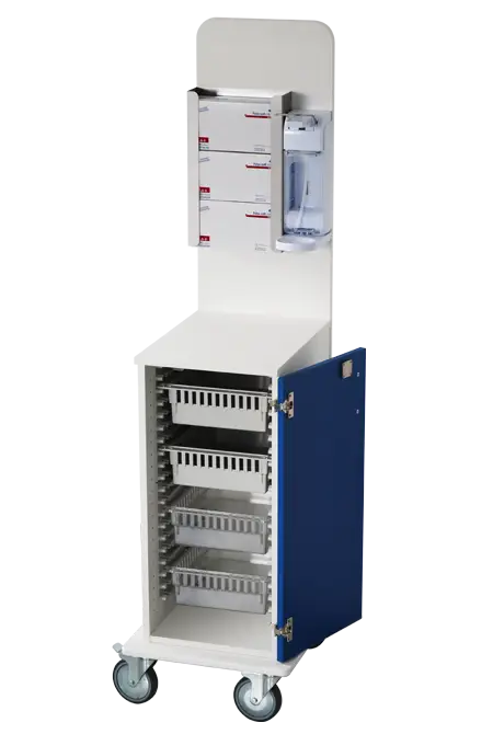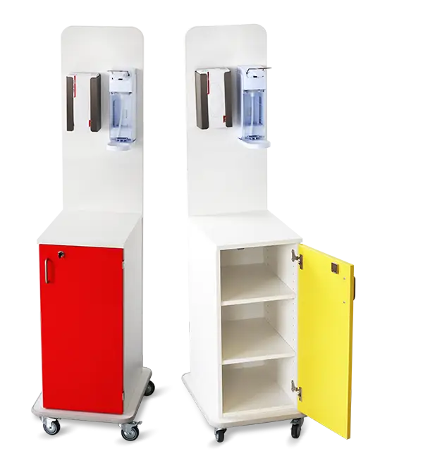 Isolierwagen sind mit Desinfektionsmittelspendern und Handschuhboxhaltern ausgestattet, die einen schnellen und einfachen Zugang zu wichtigen Hygieneartikeln ermöglichen. Warnhinweistafeln weisen deutlich auf die Benutzungsrichtlinien hin und fördern so das Bewusstsein und die Einhaltung der Hygienestandards. Im abschließbaren Korpus des Wagens befinden sich zusätzliche Materialien für die Reinigung und das Auffüllen der Verbrauchsmaterialien, was eine kontinuierliche Hygienepraxis unterstützt. Die Oberflächen des Wagens sind so gestaltet, dass sie leicht zu reinigen und zu desinfizieren sind, um eine Kreuzkontamination zu vermeiden.