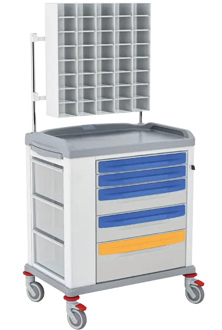 Die Grundlage des Korpuswagens bildet sein modulares System, das eine flexible Anpassung der Schubfächer und Ablagen ermöglicht. Dieses System erlaubt es, den Wagen präzise auf die spezifischen Bedürfnisse der jeweiligen Abteilung oder des Einsatzbereichs abzustimmen. Ob mehr Kapazität für medizinische Geräte benötigt wird oder spezielle Halterungen für die sichere Aufbewahrung von Zubehör – die Konfigurierbarkeit des Wagens macht es möglich.