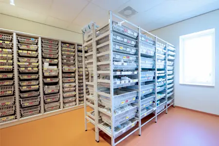 In klinischen und pflegerischen Einrichtungen spielt die effiziente Organisation von Lager und Logistik eine entscheidende Rolle für den reibungslosen Betriebsablauf und die optimale Patientenversorgung. Unsere Produktgruppe für Lager- und Logistikmobiliar ist speziell auf die Bedürfnisse in diesen sensiblen Umfeldern abgestimmt. Sie umfasst eine Vielfalt an Lösungen wie Regale und Einbauschränke, die mit ISO-Modulschalensystemen ausgestattet sind, sowie praktische Gitterwagen und ergonomisch gestaltete Packtische. Diese Produkte sind darauf ausgerichtet, die Lagerhaltung und den innerbetrieblichen Transport von medizinischem Bedarf, Medikamenten und weiteren wichtigen Materialien effizient und übersichtlich zu gestalten.